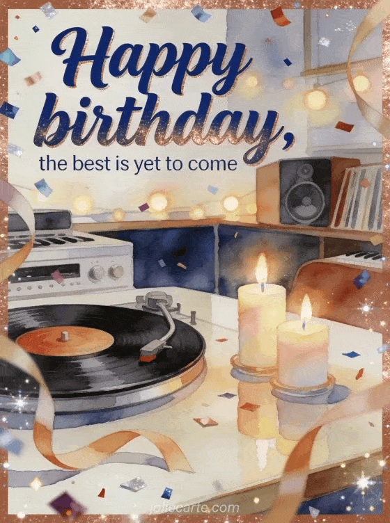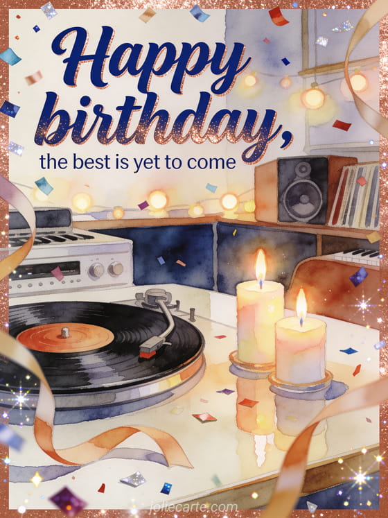 Send a stylish birthday greeting with a vinyl record spinning beside glowing candles on a polished table. Jewel-toned confetti, ribbons and soft watercolor lights create a festive music-room scene. Discover also a birthday poem for my son, a touching text for my son's birthday or a poem for my son's birthday.