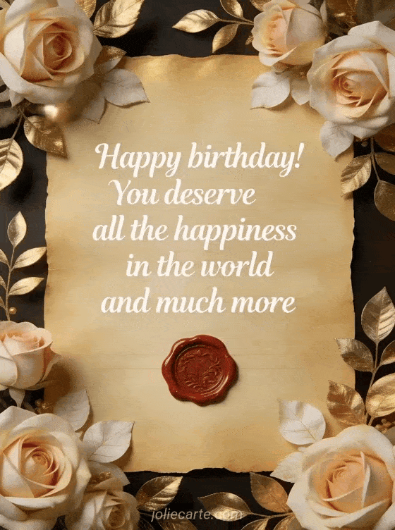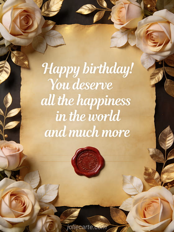 Share a heartfelt birthday message with this elegant card designed like an official golden letter with roses, leaves, and a red wax seal. Discover also flower bouquet happy birthday, wish happy birthday from a distance and happy birthday beach.