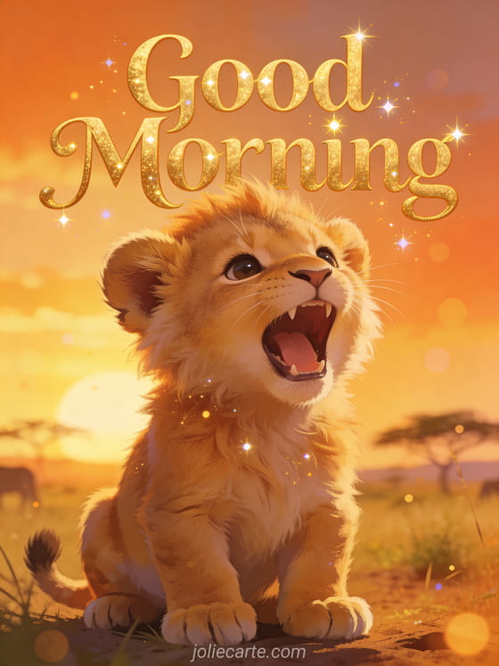A powerful and adorable good morning card with a cute baby lion cub with fluffy mane yawning in the African savanna at golden sunrise. Discover also a tender good morning message, a good morning text or a good morning animated gif.