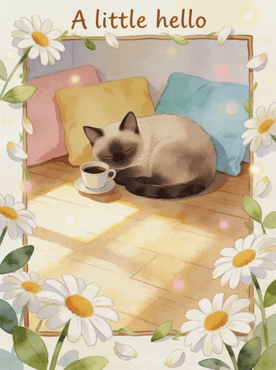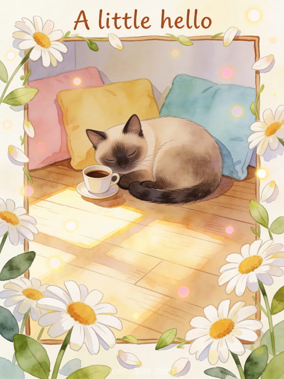 Send a sweet little hello with warm brown lettering, daisy petals, a Siamese cat, a tiny espresso cup and soft morning light. Discover also good morning my love coffee, coffee good morning with sunrise or good morning coffee coffee.