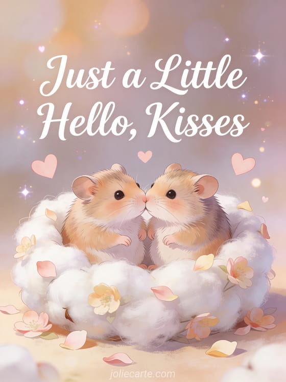 Send this adorable little hello with kisses to brighten someone's day. Two fluffy hamsters nuzzle noses in a cozy nest of petals. Discover also a hello owls card or a quick hello card.