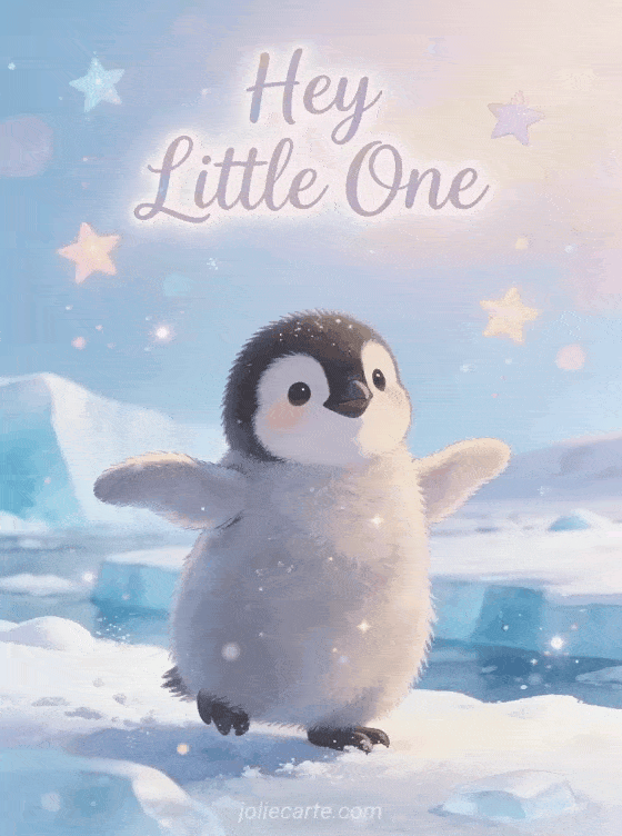 Share an adorable little one hello card with a baby penguin chick flapping tiny wings in a snowy Antarctic scene with soft blue ice. Discover also a hey there little parakeet card, a hello sunshine card or a sweet hello card.
