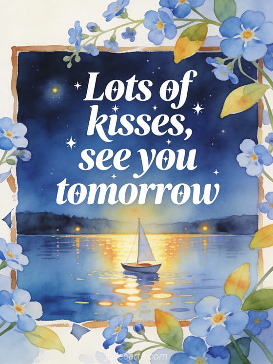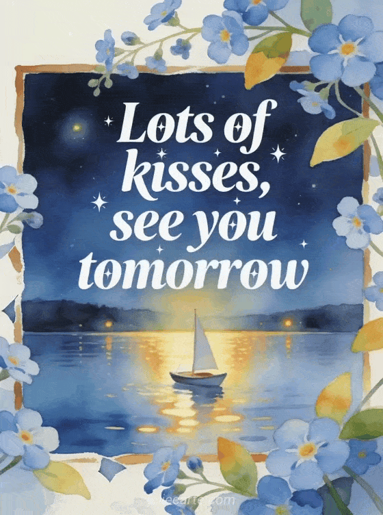 Share a blue evening wish with bold watercolor lettering, forget-me-not flowers over the border, a small sailboat on a calm lake, warm reflections, and a glowing night sky. Discover also a see you tomorrow kisses animated gif card, an evening kisses see you tomorrow card, or a big kisses see you tomorrow card.