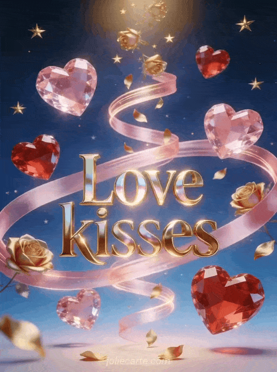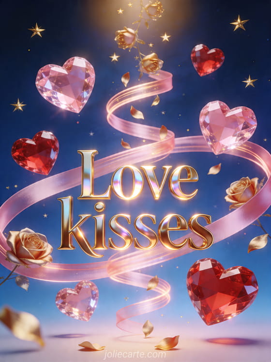 Share passionate love kisses with this free card filled with crystal hearts, pink ribbons of light and a magical night sky. Discover also couple kisses quote, tender kiss page or animated love kisses image.