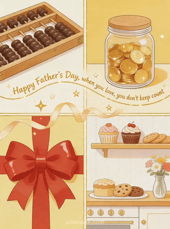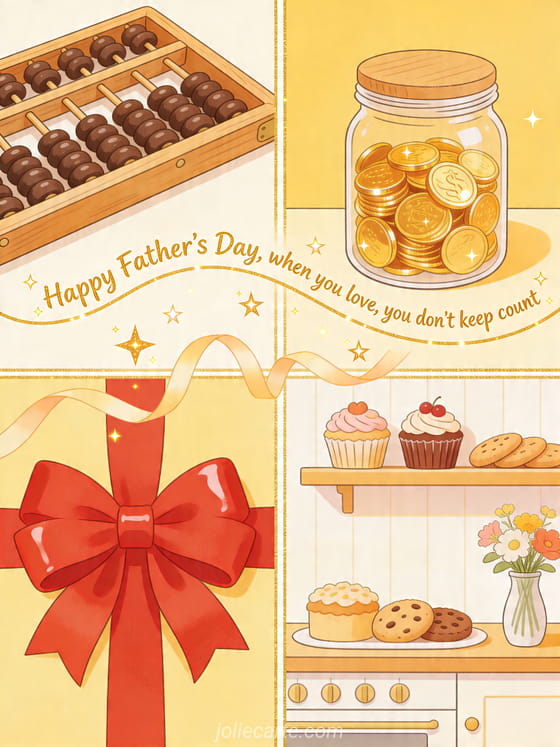 Celebrate Dad with a warm illustrated card that says love is never counted, with a wooden abacus, golden coins, a red gift bow and sweet pastries. It is a cheerful way to share affection for Father's Day. Discover also happy fathers day, happy papa's day image or happy father's day my love.