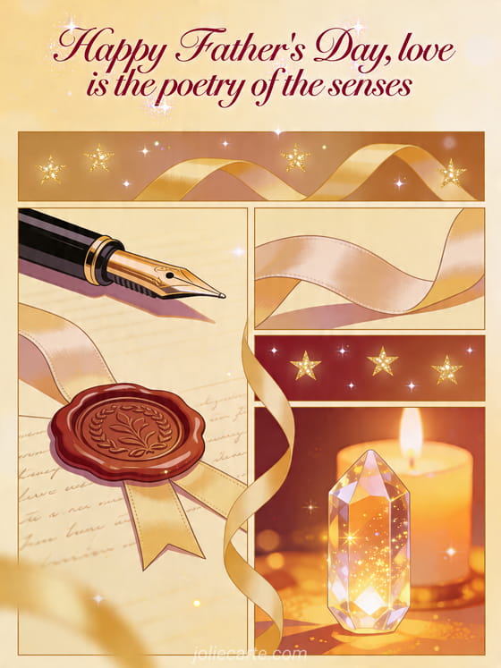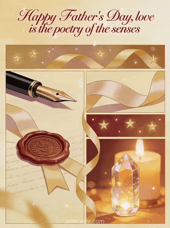 Share a refined Father's Day card with a literary mood, ruby script, candlelight, a fountain pen, wax seal, ribbon and crystal details. Send a tender message inspired by love and poetry, and discover a happy Father's Day image, good morning happy father's day or father's day image.