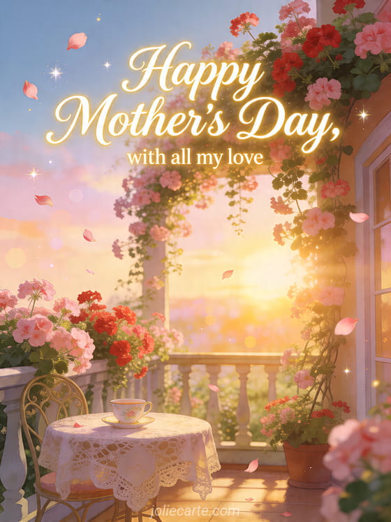 Share a joyful Mother's Day card with ivory calligraphy, a storybook garden terrace, cascading geraniums, a lace table, and a porcelain teacup in sunrise light. Discover also Happy Mother's Day deceased mom, quotes for Mother's Day, or a quote for Mother's Day.