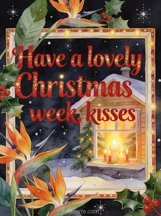 Wish a lovely Christmas week with deep red watercolor lettering, bird of paradise flowers, holly leaves, fir branches, a glowing chalet window, and warm candlelight colors. Discover also a kisses and great week card, a Monday kisses great week card, or a big kisses good week card.