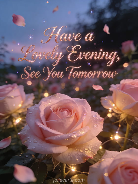 Share a beautiful good evening with this stunning rose garden twilight card. Discover also a good evening see you tomorrow images card or a good night see you tomorrow quote card or a good evening good night see you tomorrow gif card.