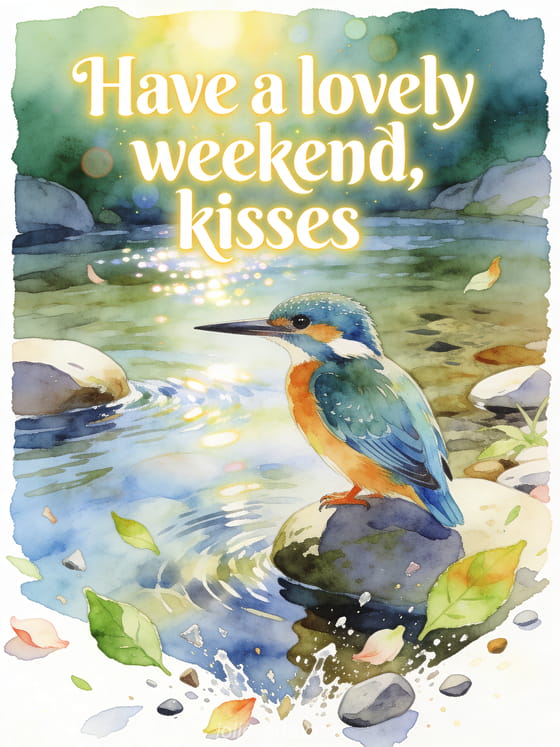Share a bright weekend wish with watercolor lettering, a kingfisher by a clear stream, smooth stones, and fresh leaves. Discover also a weekend many kisses card, a good weekend kisses image card, or a lovely weekend animated kisses card.