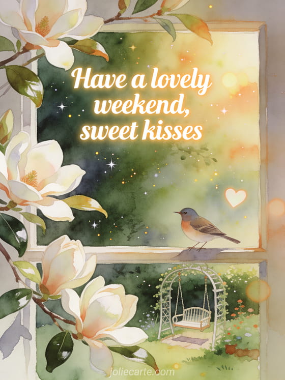 Share a lovely weekend with sweet kisses through a soft watercolor garden scene, magnolia blossoms, glossy leaves, a nightingale, and a small garden swing. You can also send a great weekend kisses photo, hi there happy weekend kisses, or great weekend everyone kisses.