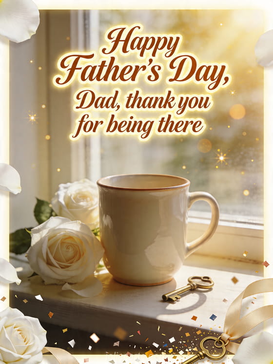 Send loving words for father's day with warm cocoa script, a realistic ceramic mug beside white rose blooms, a small brass key on a sunlit windowsill, golden sparkles and soft bokeh. Discover also a Father's Day poem, poem happy father's day dad kindness and tenderness or a happy father's day dad drawing.