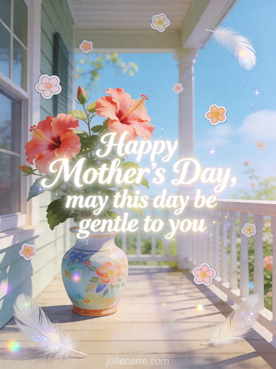 Share a bright Mother's Day message with an airy veranda, hibiscus flowers, a painted ceramic vase and soft floating feathers. Discover also a Mother's Day quote, a flower for Mother's Day or Mother's Day for my daughter.