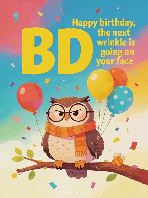 Make someone smile with this humorous birthday card showing a lovable grumpy owl with round glasses, party balloons, and confetti. You can also discover birthday man humor, funny birthday card man, or birthday man sporty gif.
