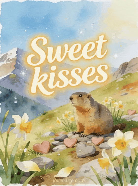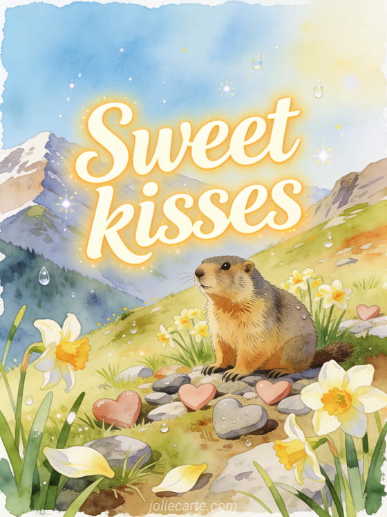 Send a tender sweet kisses greeting with a marmot sitting on an alpine slope among daffodils, fresh grass and heart-shaped pebbles in sunny mountain colors. Discover also a tender kisses gif, a butterfly kisses gif or free ai kisses.