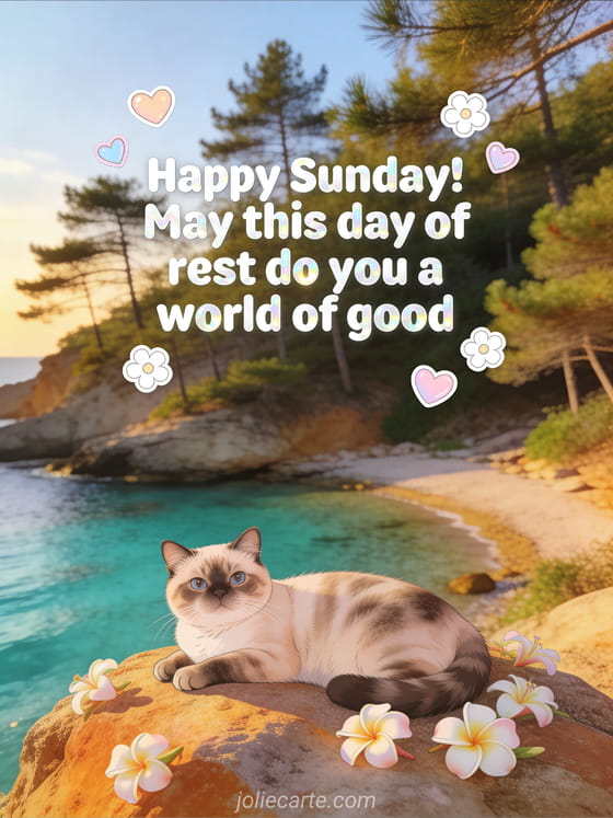 Send a warm happy Sunday message with rounded white lettering, little flowers, pastel hearts, a turquoise cove with Mediterranean pines and an exotic shorthair cat resting on a sun-warmed rock. You may also like these beautiful happy Sunday kisses images, this virtual card hello happy sunday or this pretty happy sunny Sunday card.