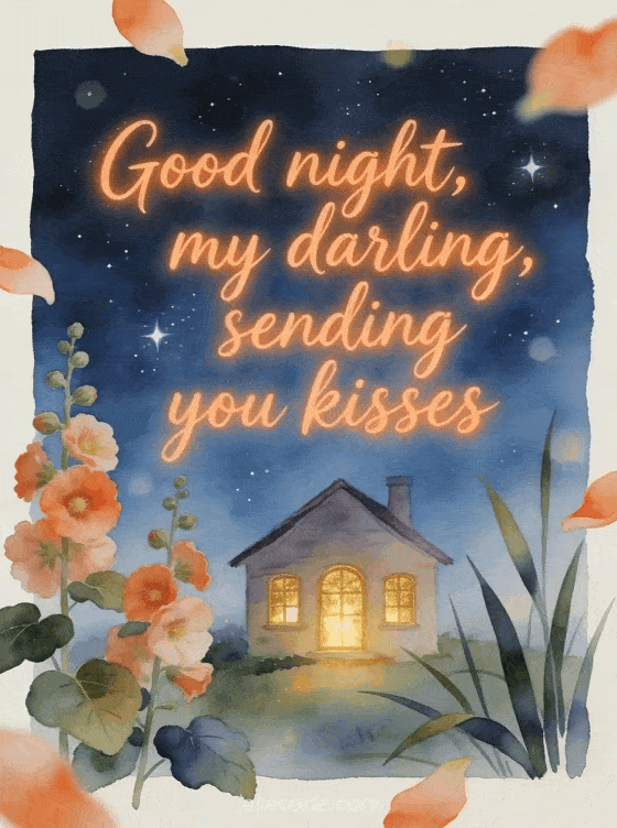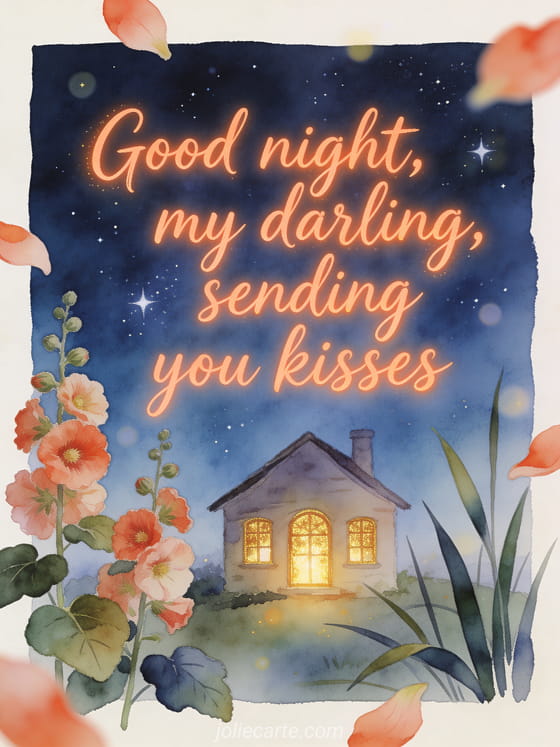 Send an affectionate good night message with coral calligraphy, a tiny cottage with golden windows, a starry sky and hollyhock flowers. Discover also a card to say good night, a good night animated virtual card or an animated good night card.