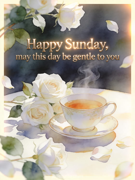 Offer a soft happy Sunday message with a delicate tea cup, white roses and warm sunlight in watercolor. Discover also a free happy Sunday image, a happy sunday sun gif or a happy Sunday with coffee image.