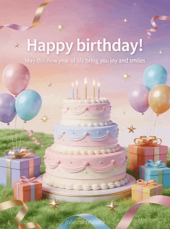 Send a message to wish a happy birthday with a refined card featuring pastel cake, gifts, balloons, and sparkling stars. Discover also birthday card text, birthday message, and birthday message sms.