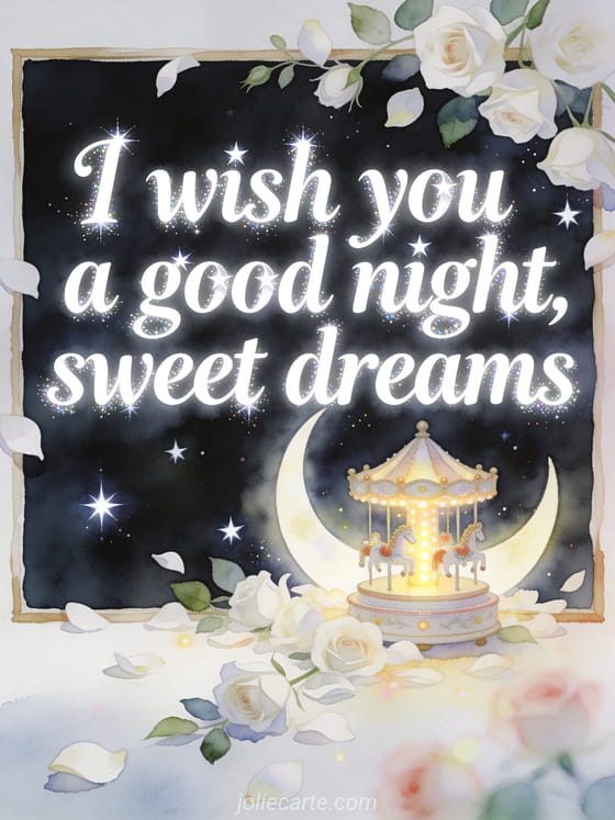 Share a soft good night message with glowing stars, white rose petals, and a carousel music box under a crescent moon. Discover also a good night message, a short message to say good night, or a pretty good night message.