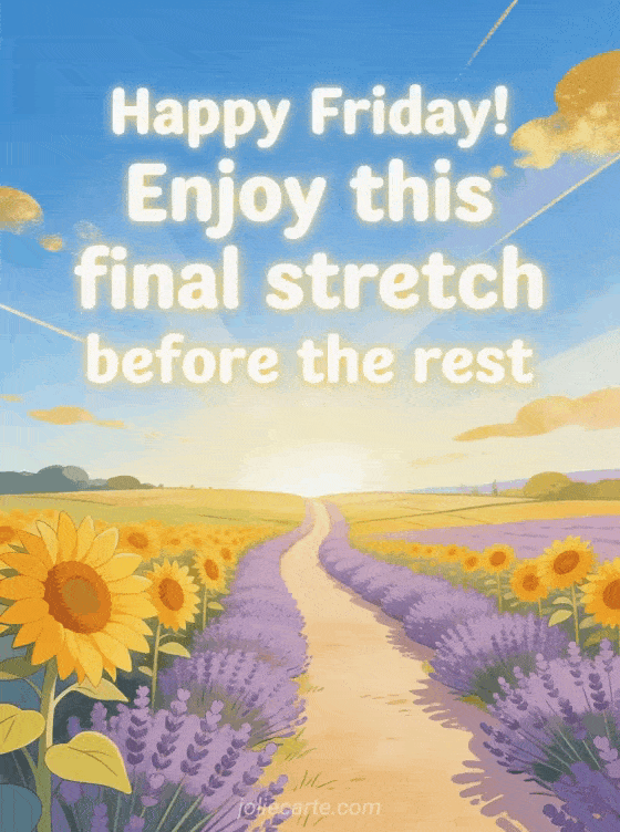 Wish a happy Friday with a spring countryside path lined with sunflowers and lavender, leading toward a bright and optimistic horizon. Discover also happy friday big kisses, good morning Friday humor or a pretty happy friday card.