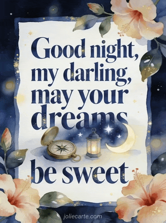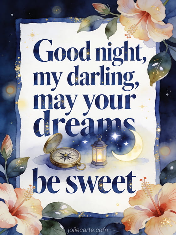 Wish him good night with a vintage compass, a tiny crescent moon lantern, bright stars and hibiscus petals in a calm watercolor night glow. Discover also the most beautiful good night message, a free virtual good night card or a good night kisses card.