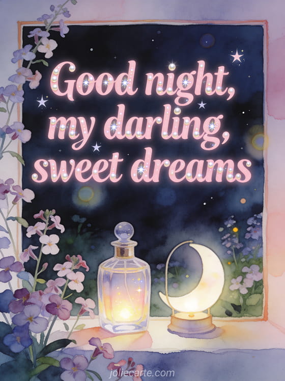Wish her good night with a glowing perfume bottle, a crescent moon lamp, aubrieta blossoms and a peaceful night garden in watercolor. Discover also a free good night card, a nice good night message or a message to say good night.
