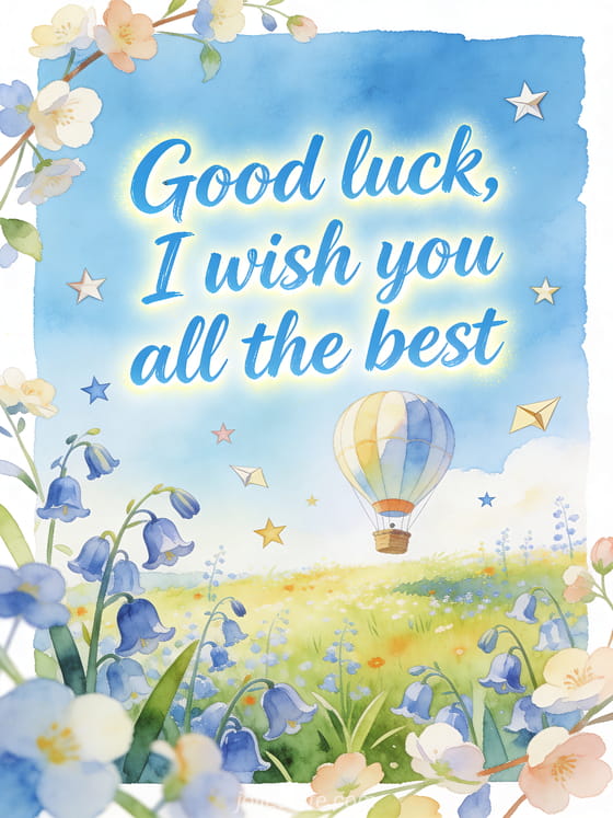 Share good luck, I wish you all the best with sky blue lettering, a hot air balloon rising above a bright meadow, bellflowers and floating paper stars. Discover also good luck for exams image, good luck for what comes next image or good luck cat image.