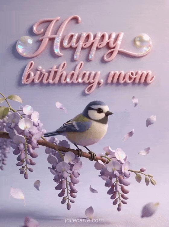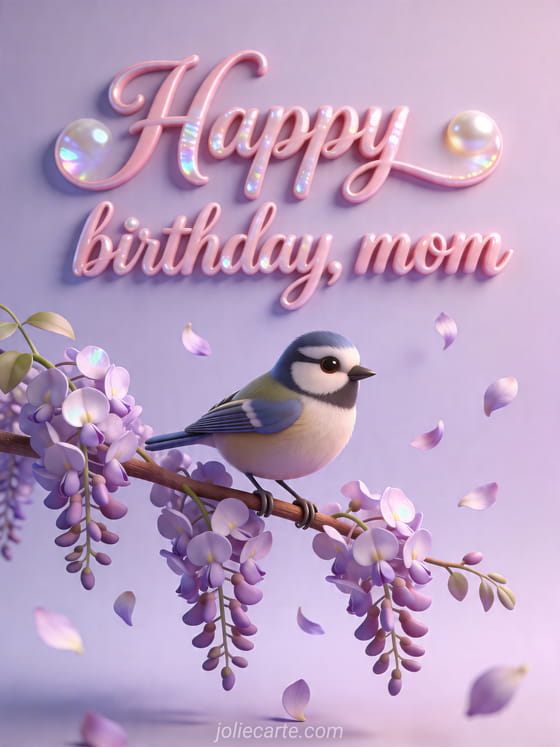 Share a sweet birthday wish for your mom with this tender card featuring a little blue tit bird on a blooming wisteria branch with falling petals. Discover also happy birthday mom, touching mom birthday text and mom birthday drawing.