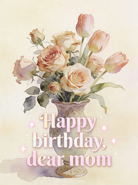 Send a loving birthday wish to your mom with this tender watercolor card featuring vintage roses and tulips in a delicate vase. Discover also touching happy birthday mom card, heart heart happy birthday mom and mom birthday greeting card.