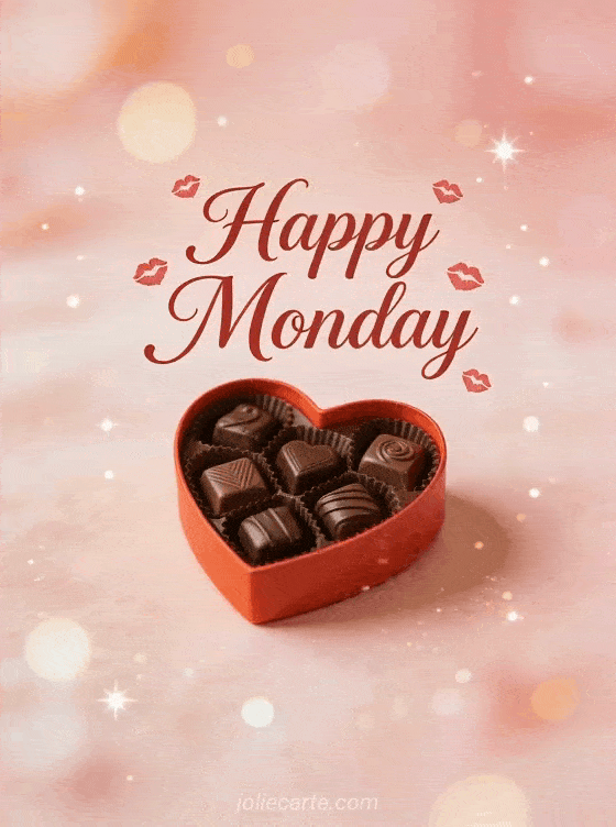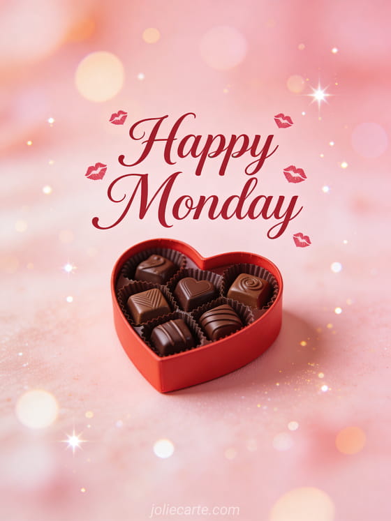 Share a sweet Monday card with kisses and a heart-shaped chocolate box. A romantic and loving way to start the week. Discover also a happy positive monday card or a have a great day monday card.