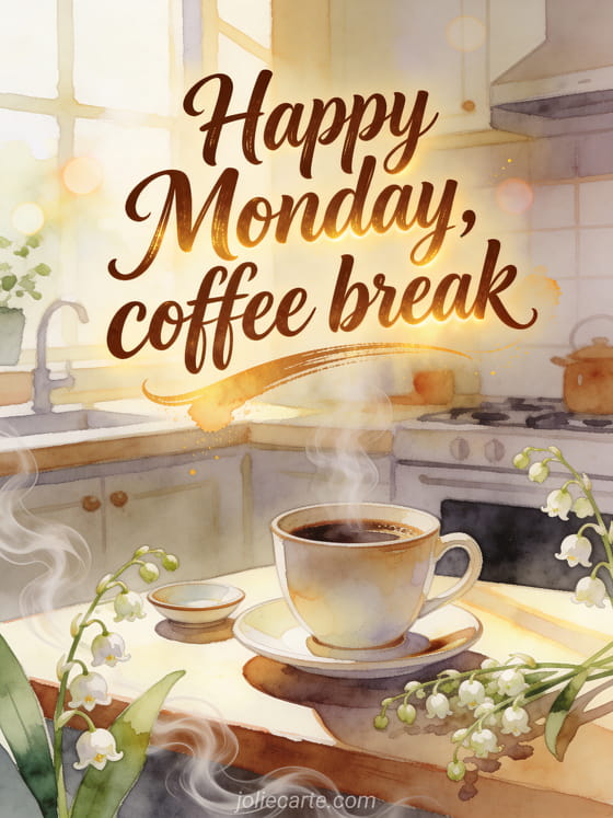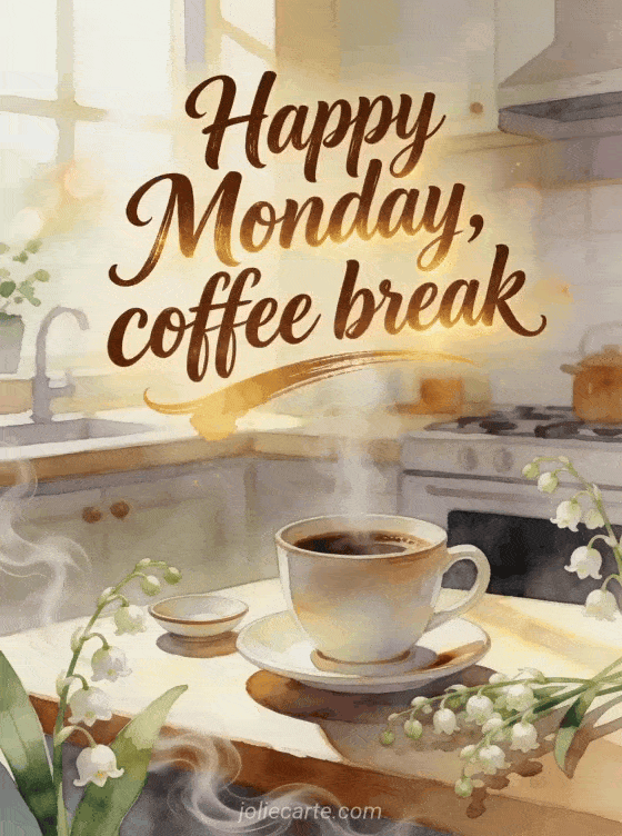 Start Monday with a cozy coffee greeting, mocha lettering, a steaming cup, lily of the valley stems, a saucer and warm kitchen light. Discover also a good morning Monday animated gif, happy Monday with rain images or a happy Monday cat gif.