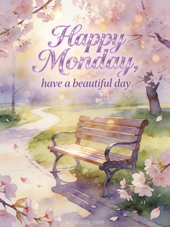 Share a gentle happy Monday greeting and wish a beautiful day with elegant lavender script and pearly shine. This free card shows a sunlit park bench under cherry blossoms beside a winding path, filled with spring freshness. Discover also a good morning Monday image card, a happy monday flowers image card or a snowy happy Monday image card.