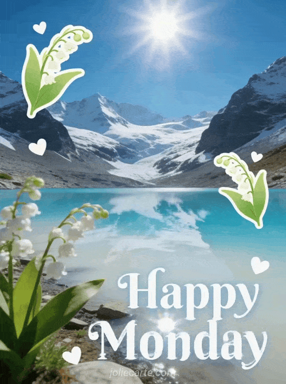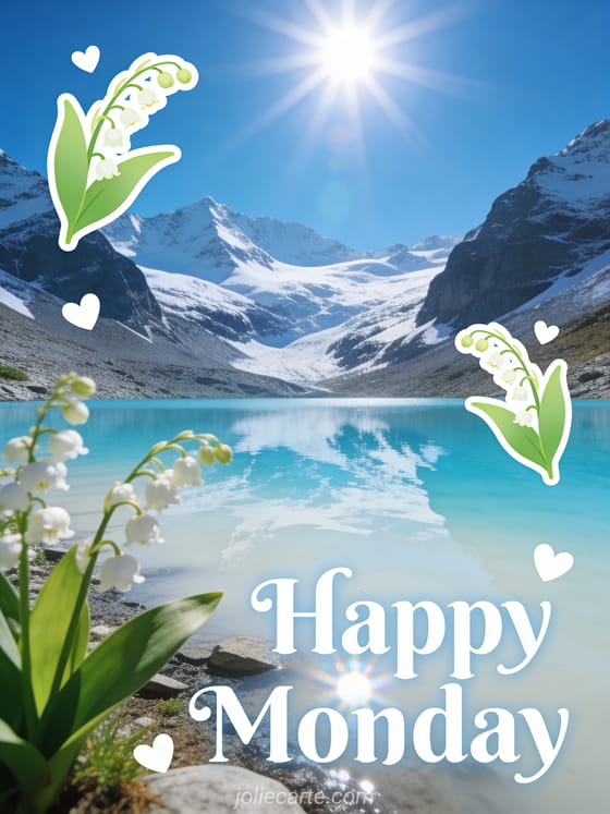 Share a fresh monday card with pure white lettering, lily of the valley, tiny white hearts, a milky blue glacial lake and snowy mountains glowing in the sun. You can also send funny happy monday humor, a happy monday cat kisses image or these rainy happy monday images.