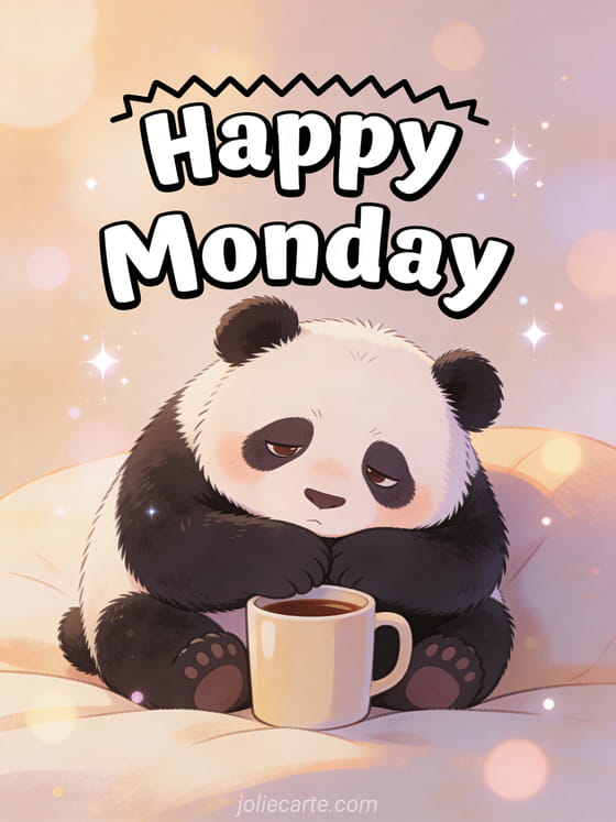 Start the week with a laugh by sending this hilarious happy Monday card. A tired panda bear hugs a coffee mug in a relatable Monday humor scene. Discover also a happy Monday gif card or a happy Monday card.