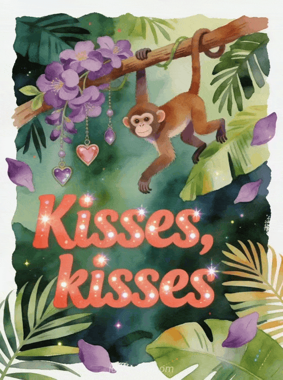 Send a playful kisses greeting with coral letters, a jungle branch, a monkey, violet flowers, dangling heart charms and tropical leaves. Discover also sending kisses image, a marmot kisses gif or sending kisses.
