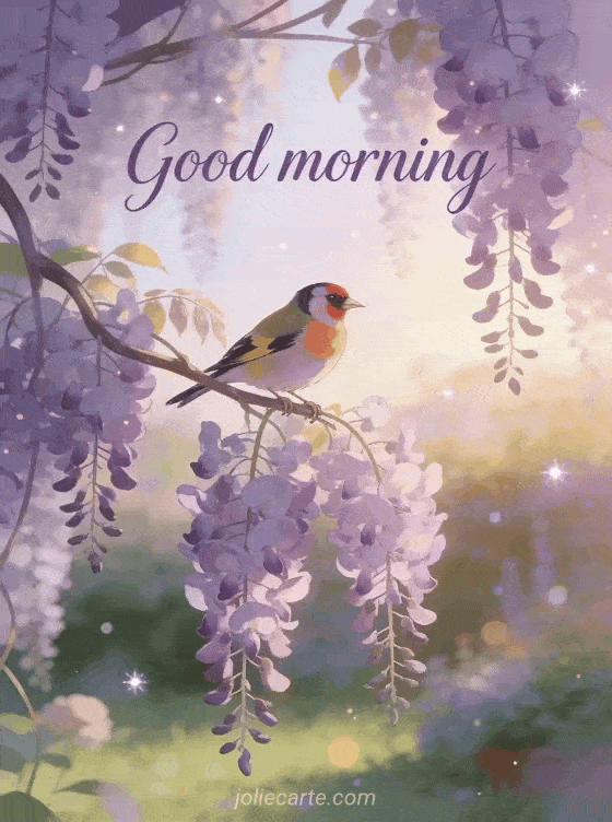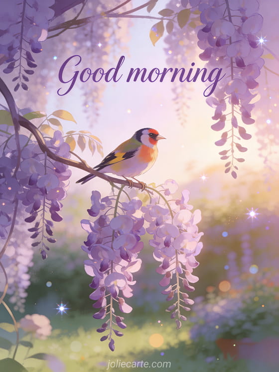 Share a beautiful dawn morning greeting with a goldfinch perched on blooming wisteria. Discover also a message good morning my darling or a good morning sunny card.