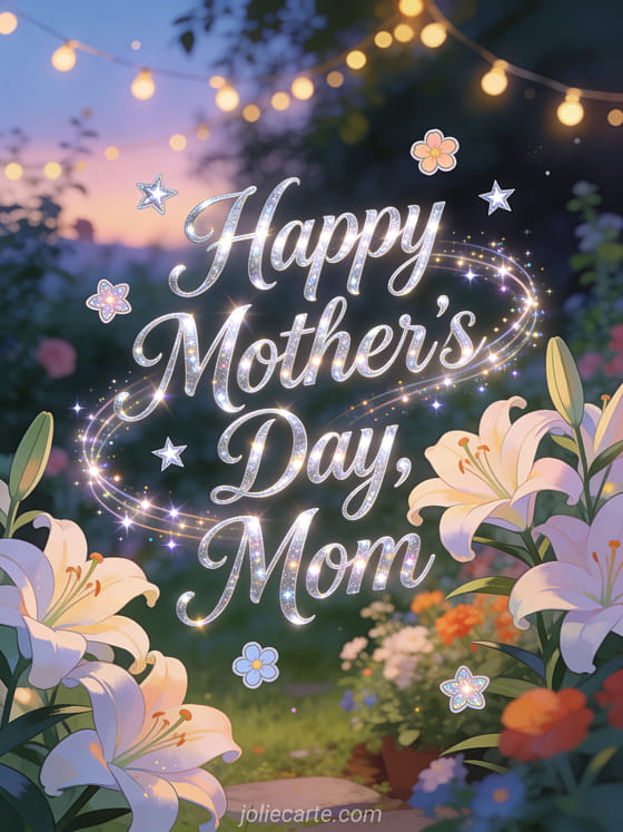 Surprise your mom with this beautiful mother's day animated card featuring shimmering silver script and lilies glowing under fairy lights. Discover also a mother's day image or a pretty mother's day card.