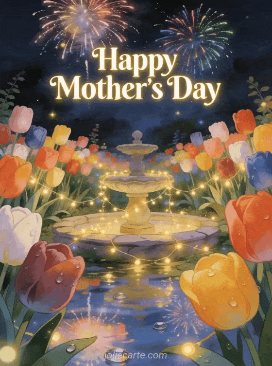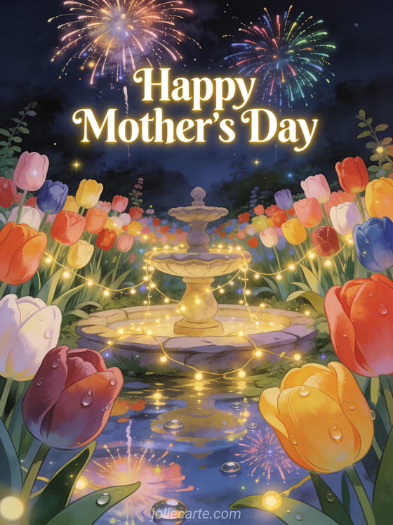 Send this beautiful Mother's Day card with flowers and celebrate your mom with a magical night garden filled with vibrant tulips and fireworks. Discover also an original mother's day card or a mother's day card mom.