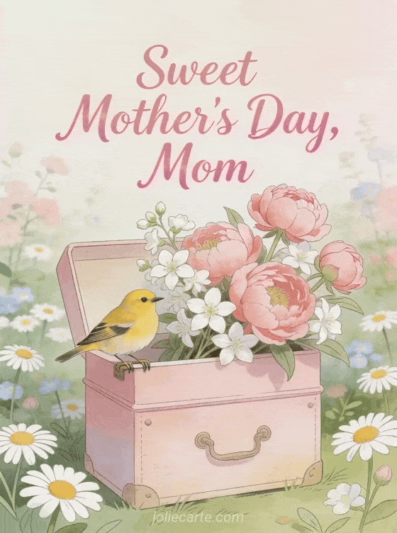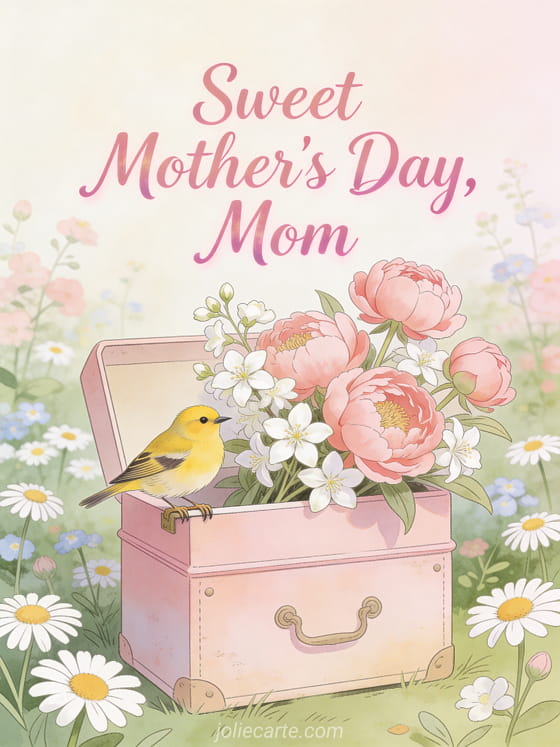 Delight Mom with this elegant card featuring a goldfinch on a pastel pink vintage mailbox overflowing with peonies and jasmine. Discover also a free mother's day card or mother's day card text.