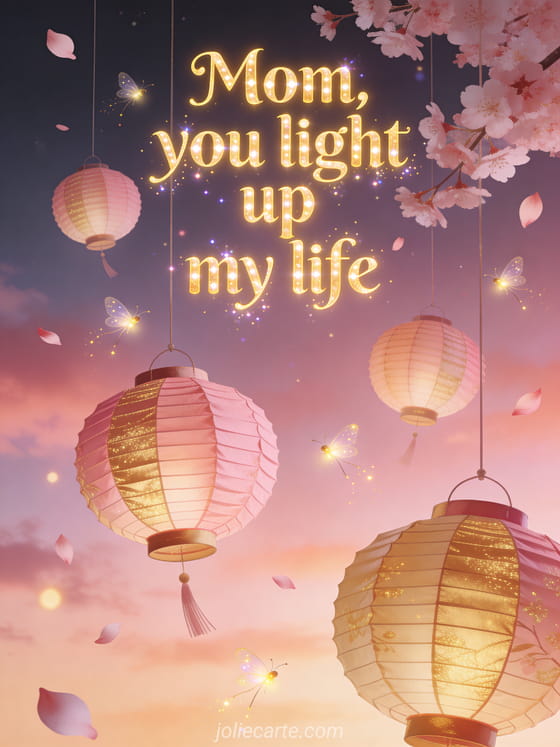 Celebrate Mom with this enchanting mother's day card featuring glowing golden letters, floating lanterns and cherry blossoms. Discover also a mother's day card template or a pinterest mother's day card.