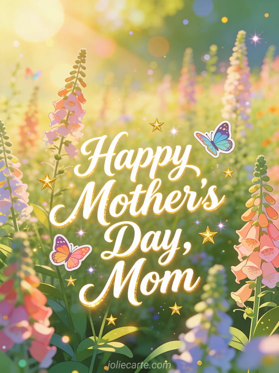 Surprise Mom with these vibrant mother's day cards featuring flowing white script with golden highlights and foxgloves swaying in warm sunlight. Discover also images for mother's day or wish happy mother's day.