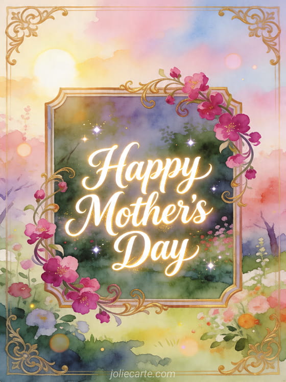 Choose a graceful Mother's Day card with ivory calligraphy, vivid fuchsia blossoms, and a decorative gilded frame. Discover also a heartfelt Mother's Day message, a Mother's Day heart card, or a love poem for Mother's Day.