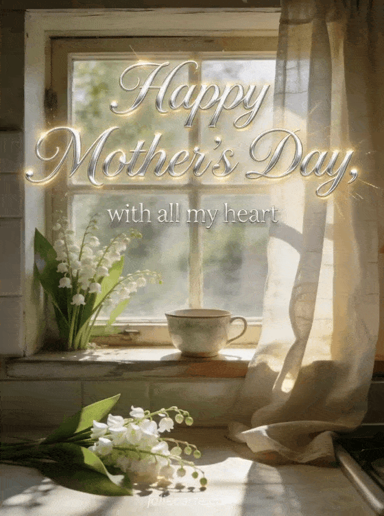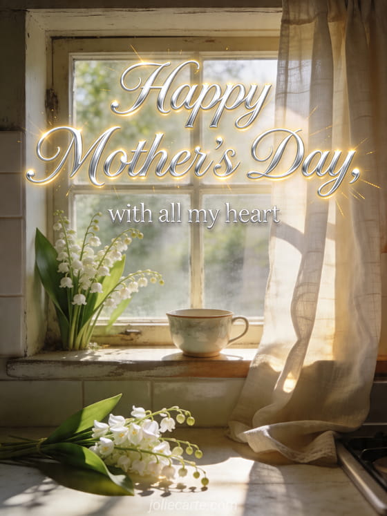 Share a peaceful Mother's Day greeting with a rustic kitchen window lined with lily of the valley, a porcelain teacup and sunlit linen curtains. You can also send how to wish your mom a happy Mother's Day, Mother's Day photo or a Mother's Day poem.