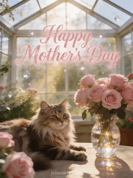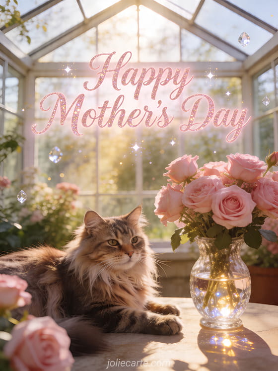 Share a luminous Mother's Day card with blush script, a Maine Coon resting in a sunlit conservatory, blooming pink roses, and a crystal vase. Discover also good morning and Happy Mother's Day, verses for Mother's Day, or Happy Mother's Day to a mom-to-be.
