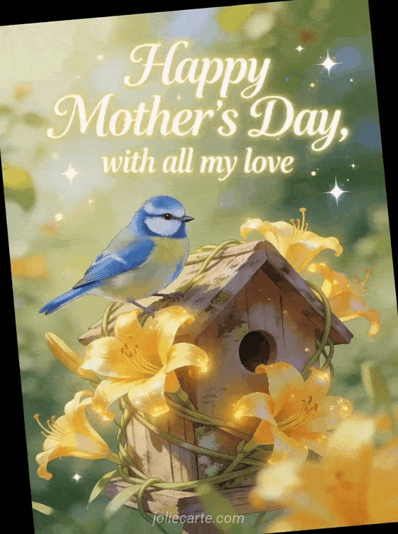 Share an affectionate Mother's Day card with a blue tit, a rustic birdhouse wrapped in daylilies and fresh orchard light. Discover also Happy Mother's Day mother-in-law, Mother's Day poems or texts for Mother's Day.