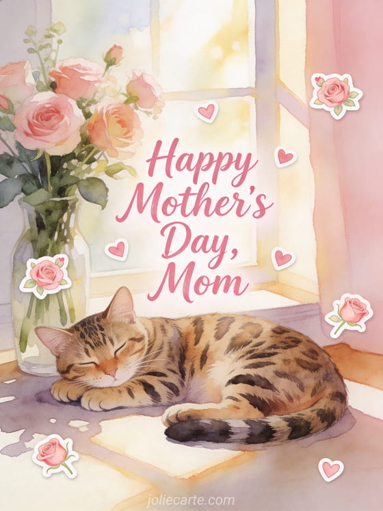 Surprise your mom with this beautiful mother's day greeting card featuring soft pink watercolor calligraphy and a gentle Bengal cat beside carnations. Discover also happy mother's day or a happy mother's day message.