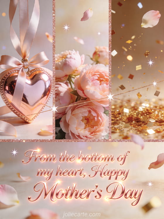 Share a Mother's Day heart card with a polished ornament, blush peonies, silk ribbons, and golden confetti. Discover also a love poem for Mother's Day, happy Mother's Day, or Happy Mother's Day dear mom.