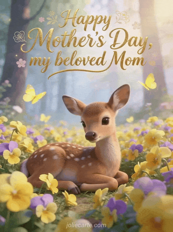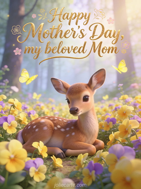 Surprise your beloved Mom with this enchanting spring card featuring a little fawn among yellow primroses and lemon butterflies. Discover also a mother's day animated card or a mother's day image.