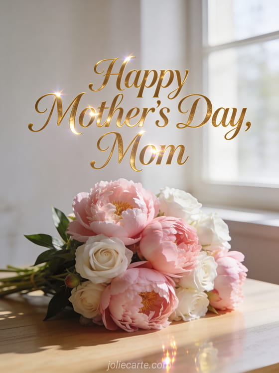 Share this gorgeous mother's day card featuring a sumptuous bouquet of pink peonies and white roses in morning light. Discover also wish happy mother's day or original mother's day card.
